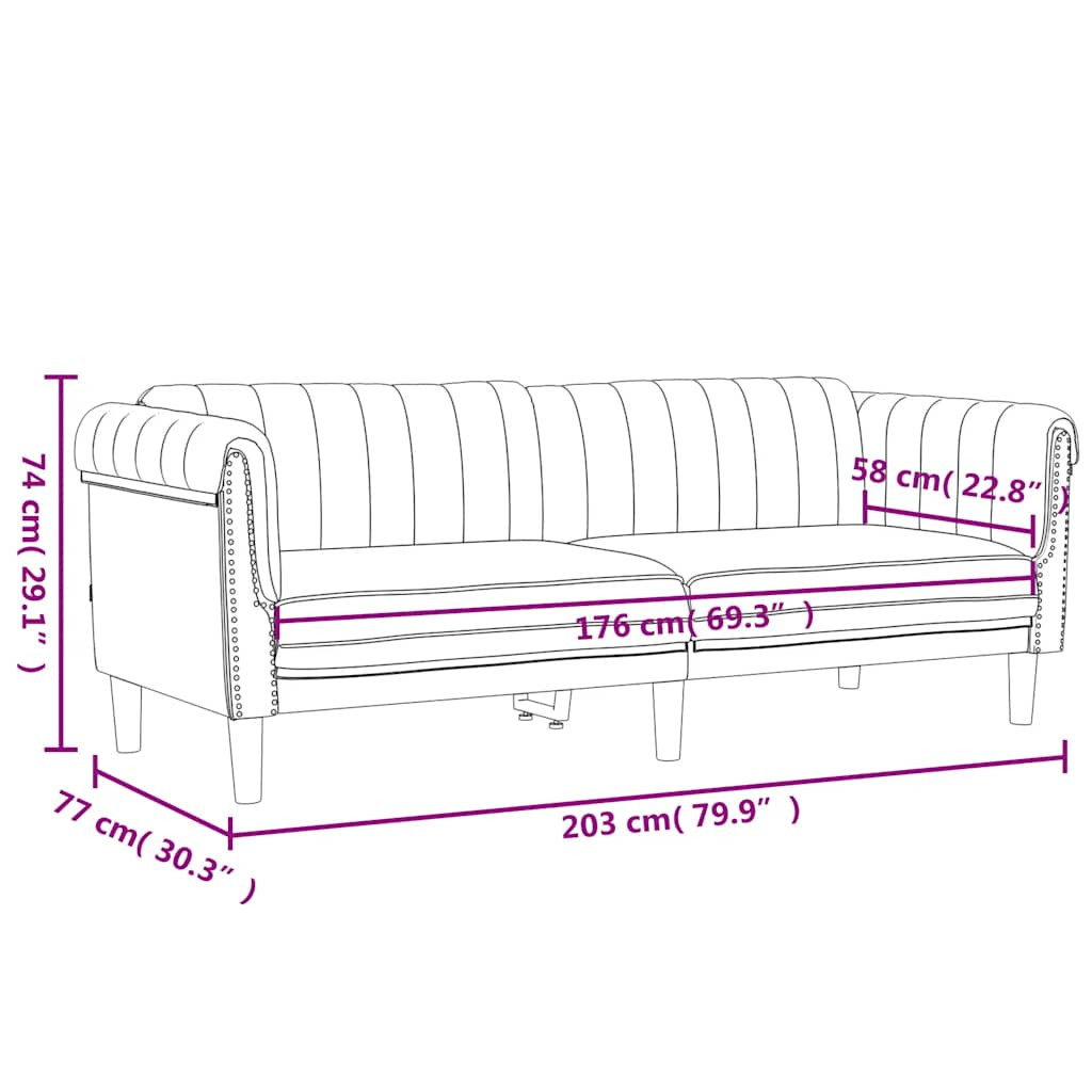 Ez a 3 személyes kanapé kiváló hely a beszélgetéshez, olvasáshoz, tévézéshez vagy akár pihenéshez. Célja, hogy otthona fókuszpontja lesz. Puha bársony: A bársony egy puha, fényűző anyag, amely sűrű, egyenletesen vágott sima szálairól ismert. A bársony anyag jellegzetesen puha, így kényelmes tapintású.Kényelmes ülőélmény: A kanapé rendkívül kényelmes a vastagon párnázott ülésnek, karfának, és háttámlának köszönhetően.Tömör lábak: A kárpitozott fotelt erős lábak tartják, amelyek stabilitást, biztonságot, és szilárdságot biztosítanak.Szemet gyönyörködtető dizájn: Egyszerű, de modern dizájnjával ez a nappali ülőgarnitúra figyelemfelkeltő darab lesz a szobájában. Maximum 110 kg ülésenként. Ügyeljen a nyílt tűz és más erős hőforrások veszélyére a termék közelében.