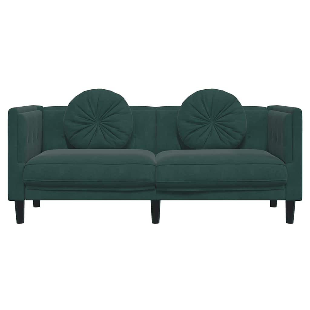 sötétzöld bársony kétszemélyes kanapé párnákkal
