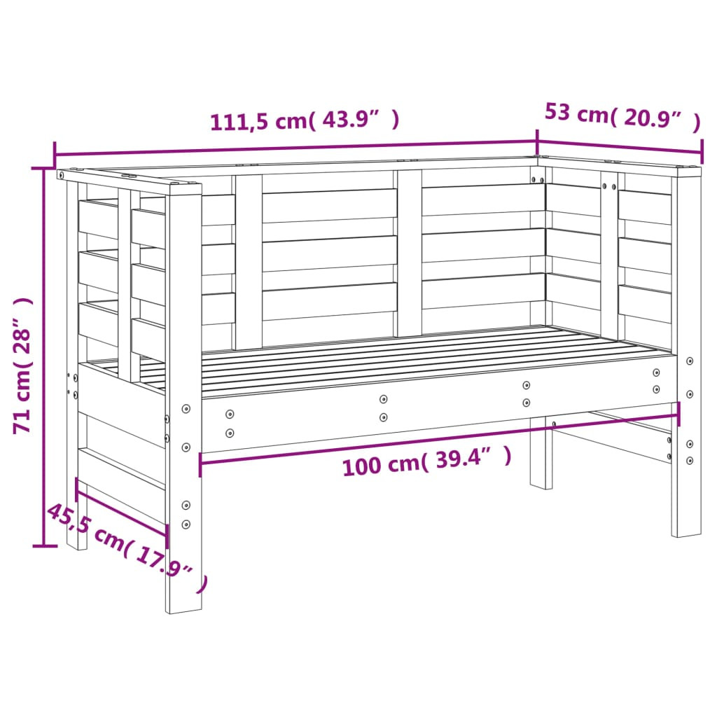 Ez a fa kerti pad tökéletes kültéri használatra, és kertje, terasza, udvara stb. központi eleme lesz. Tömör fenyőfa: A kültéri pad a szilárdság és a stabilitás érdekében tömör fenyőfából készült. A tömör fenyőfa egy gyönyörű, természetes anyag. A fenyőfa egyenes erezetű, a csomók adják az anyag jellegzetes, rusztikus megjelenését.Kényelmes ülés: A kerti pad karfái és háttámlája a lehető legnagyobb kényelmet nyújtják.Rácsos kialakítás: Az udvari pad rácsos kialakítása megakadályozza a víz felgyülemlését, szárazon tartja az ülést, és megakadályozza a szükségtelen korhadást.Széleskörű felhasználás: A kerti ülőbútor tökéletes bármilyen verandára, teraszra, udvarra, pázsitra, kertbe stb. Jó tudni:A kültéri bútor szépségének megőrzése érdekében javasoljuk, hogy vízálló huzattal fedje be. Maximum 110 kg ülésenként.