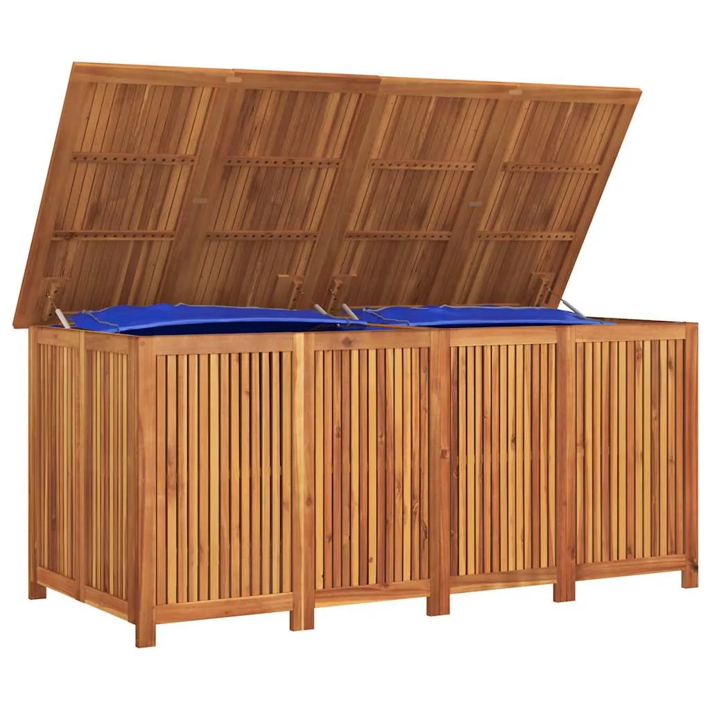 Ez a kerti, tömör fa tárolóláda bőséges tárolóhelyet biztosít a kerti bútorok párnáinak, kertészkedéshez használt szerszámoknak, és bármi másnak, amit elérhető közelségben szeretne tudni kültéri környezetében. Beltéren is használható. Tömör akácfa: A fa tárolódoboz tömör akácfából készült. A tömör akácfa egy gyönyörű természetes anyag, amely sűrű, erős és strapabíró.Bőséges tárolóhely: A tárolóhely megkönnyíti a holmik rendezett tárolását. Alkalmas ülőpárnák, hátpárnák, takarók, és egyebek tárolására.Vízálló zsák: A cipzáras, vízálló zsák megóvja tárgyait a nedvességtől. Jó tudni:A kültéri bútor szépségének megőrzése érdekében javasoljuk, hogy vízálló huzattal fedje be.