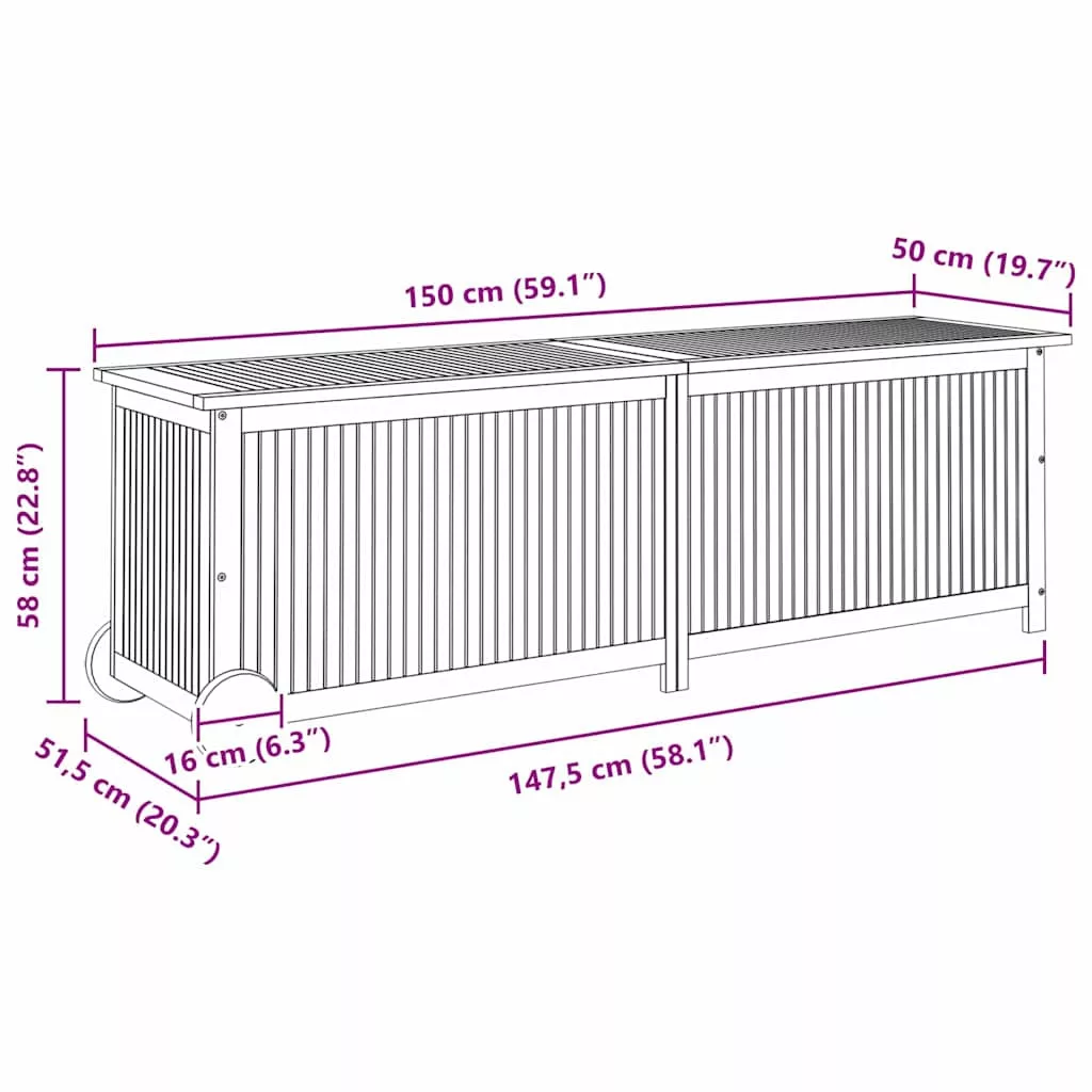 Ez a kerti tömör fa tárolóláda bőséges tárolóhelyet biztosít a kerti bútorok párnáinak, játékoknak, kertészkedéshez használt szerszámoknak és persze bármi másnak, amit elérhető közelségben szeretne tudni kültéri környezetében. Beltéren is használható. Tartós anyag: A kültéri tárolóláda tömör akácfából készült. A tömör akácfa egy gyönyörű, természetes anyag, amely tömör, masszív és tartós.Bőséges tárolóhely: A tárolóhely megkönnyíti a holmik rendezett tárolását. Alkalmas ülőpárnák, hátpárnák, takarók, játékok és egyéb tárgyak tárolására.Praktikus kialakítás: A cipzáras, vízálló belső zsák megvédi a tárgyait a nedvességtől és a portól. A kerti párnatároló láda kerekekkel és fogantyúval lett felszerelve, így könnyen mozgatható. Jó tudni:A szerelés megkönnyítése érdekében minden termék kézikönyvvel együtt kerül kiszállításra. Megjegyzés:A kültéri bútor szépségének megőrzése érdekében javasoljuk, hogy vízálló huzattal fedje be.