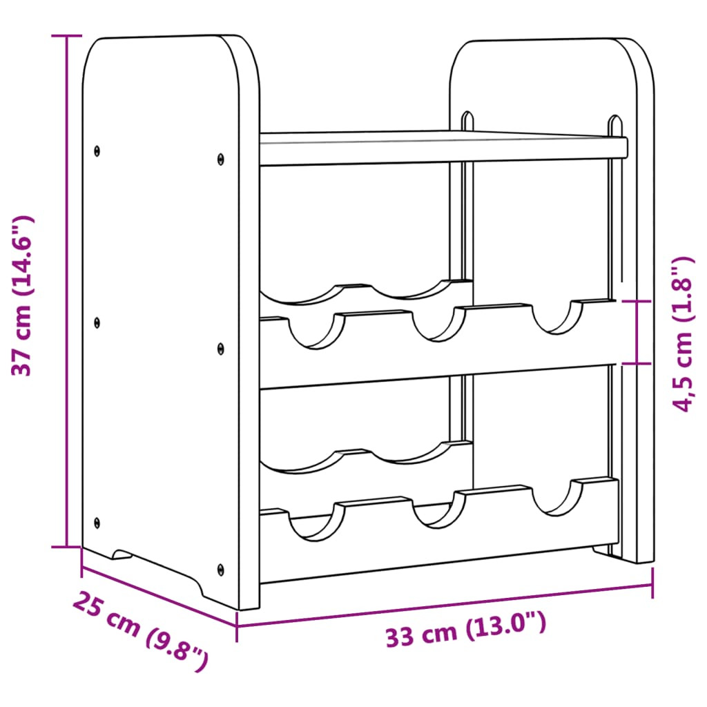 Tárolja, érlelje és mutassa be stílusosan borait ezzel a fa bortartóval! Tömör fenyőfa: Ez a borospolc tömör fenyőfából készült. A tömör fenyőfa egy gyönyörű, természetes anyag. A fenyőfa egyenes erezetű, a csomók pedig jellegzetes, rusztikus megjelenést biztosítanak az anyagnak.Bőséges tárolóhely: A 2 szintes bortartó polc 6 palack bor tárolására alkalmas. Minden szinten 3 palack fér el.Hullámos kialakítás: A hullámos kialakításnak köszönhetően a polc nedvesen tartja a parafadugót, hogy a bor friss maradhasson.Széleskörű alkalmazás: A borosüveg tartó használható konyhában, kamrában, szekrényben, étkezőben, pincében, pulton, bárban vagy borospincében... stb.