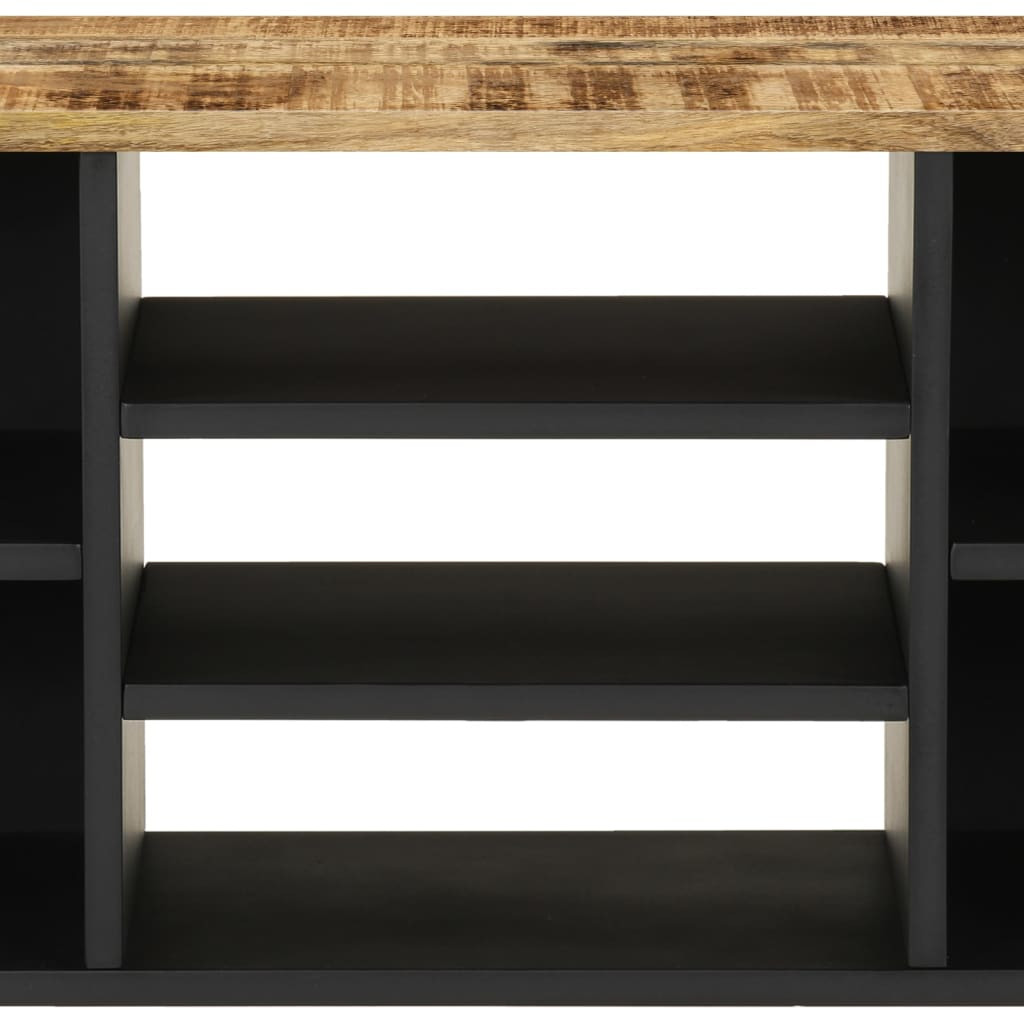 Ez a TV-szekrény trendi és praktikus kialakításával ideális választás szobájába. Tömör akácfa: Ez a multimédia-szekrény tömör mangó- és szerelt fából készült. A tömör mangófa egy erős, trópusi keményfa, melyből strapabíró bútorok készíthetőek. A fa gyönyörű erezetének köszönhetően minden darab kissé különbözik a többitől.Bőséges tárolóhely: A 4 nyitott rekesszel és 3 polccal ellátott TV-állvány bőséges tárolóhelyet kínál magazinjai, DVD-i és egyéb kellékei számára.Stabil lábak: A komód vaslábai szilárdságot és stabilitást biztosítanak.Bemutatófunkció: A TV-bútor masszív teteje ideális dekorációs elemek, például képkeretek és növények megjelenítésére. Jó tudni:A szerelés megkönnyítése érdekében minden termék kézikönyvvel együtt kerül kiszállításra.A szín és erezet darabonként változik, így minden darab egyedi. A kiszállítás véletlenszerűen történik, biztosítva terméke exkluzivitását és egyediségét.