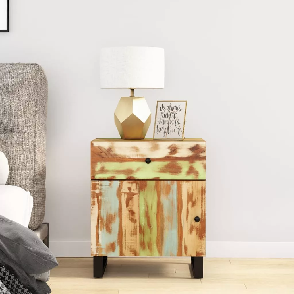 Vigyen ipari bájt szobájába ezzel az éjjeliszekrénnyel! Otthona praktikus és dekoratív kiegészítője lesz. Tömör újrahasznosított fa: A tömör újrahasznosított fa újrafelhasznált faanyagokból áll, például tíkfából, mangófából, fenyőfából és bükkfából. Ezeket a faanyagokat régi épületekből, például gyárakból, fészerekből és hajókból hasznosítják újra. Ez rendkívül környezetbarát megoldássá teszi a bútorgyártásban. Mivel minden darab kézzel készült és egyedi, a színek darabonként változhatnak. Találhat kék, zöld, és esetenként narancssárga, piros és rózsaszín árnyalatokat.Bőséges tárolóhely: A fiókkal és rekesszel ellátott ágy melletti asztal bőséges tárolóhelyet kínál alapvető holmijai kézközelben történő rendezett tárolásához.Stabil lap: A kisszekrény masszív lapja tökéletes helyet nyújt csészék, könyvek és egyéb dísztárgyak elhelyezésére.Fémlábak: A hálószobabútor fém lábai szilárdságot és stabilitást biztosítanak. Figyelem:A dőlés megakadályozása érdekében a terméket a mellékelt tartóelem segítségével rögzíteni kell a falhoz. Megjegyzés:Az egyszerű összeszerelés érdekében minden termékhez mellékelünk összeszerelési útmutatót.A színe és erezete darabonként változhat, így minden bútordarab egyedi, és kissé eltér a többitől. A kiszállítás véletlenszerűen történik, biztosítva terméke exkluzivitását és egyediségét.