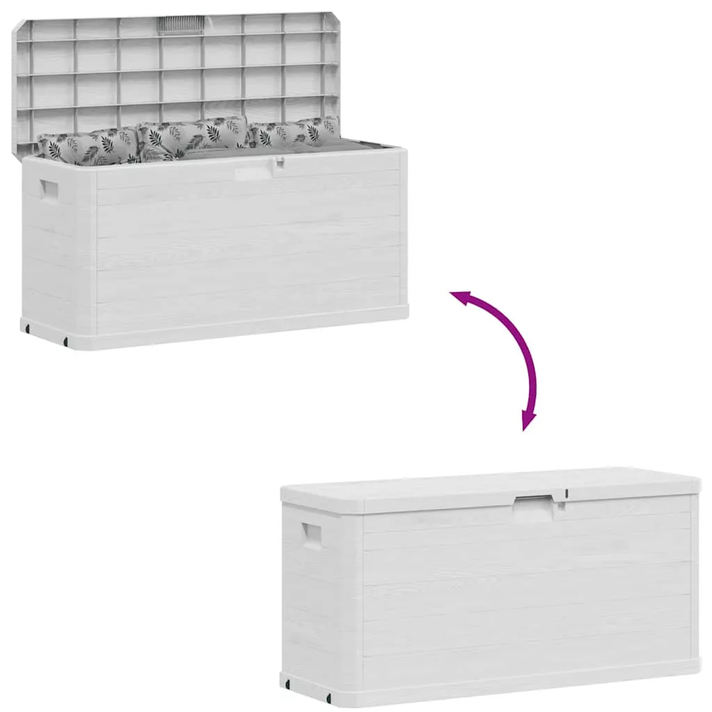Ez a stílusos tárolóláda kiválóan alkalmas párnák, takarók, szerszámok, és egyebek tárolására. Stabil és tartós: A műanyag egy sokoldalú anyag, amely könnyű, tartós és könnyen tisztítható. Az anyaga tartós, időjárásálló műanyag, így ez a tárolóláda alkalmas úgy beltéri, mint kültéri használatra.Bőséges tárolóhely: A láda bőséges helyet biztosít a párnák, takarók, és egyéb olyan tárgyak tárolására, amelyeket nem szeretne szem előtt tartani.Többszörös felhasználás: A kerti tárolóláda szilárd felépítésének köszönhetően tárolóként és szerszámos ládaként is használható.Időtlen dizájn: A fa textúrájú kialakítása miatt ez a kerti tárolóláda időtlen megjelenéssel bír, bármilyen dekorációba tökéletesen illeszkedve. Jó tudni:A kültéri bútor szépségének megőrzése érdekében javasoljuk, hogy vízálló huzattal fedje be.